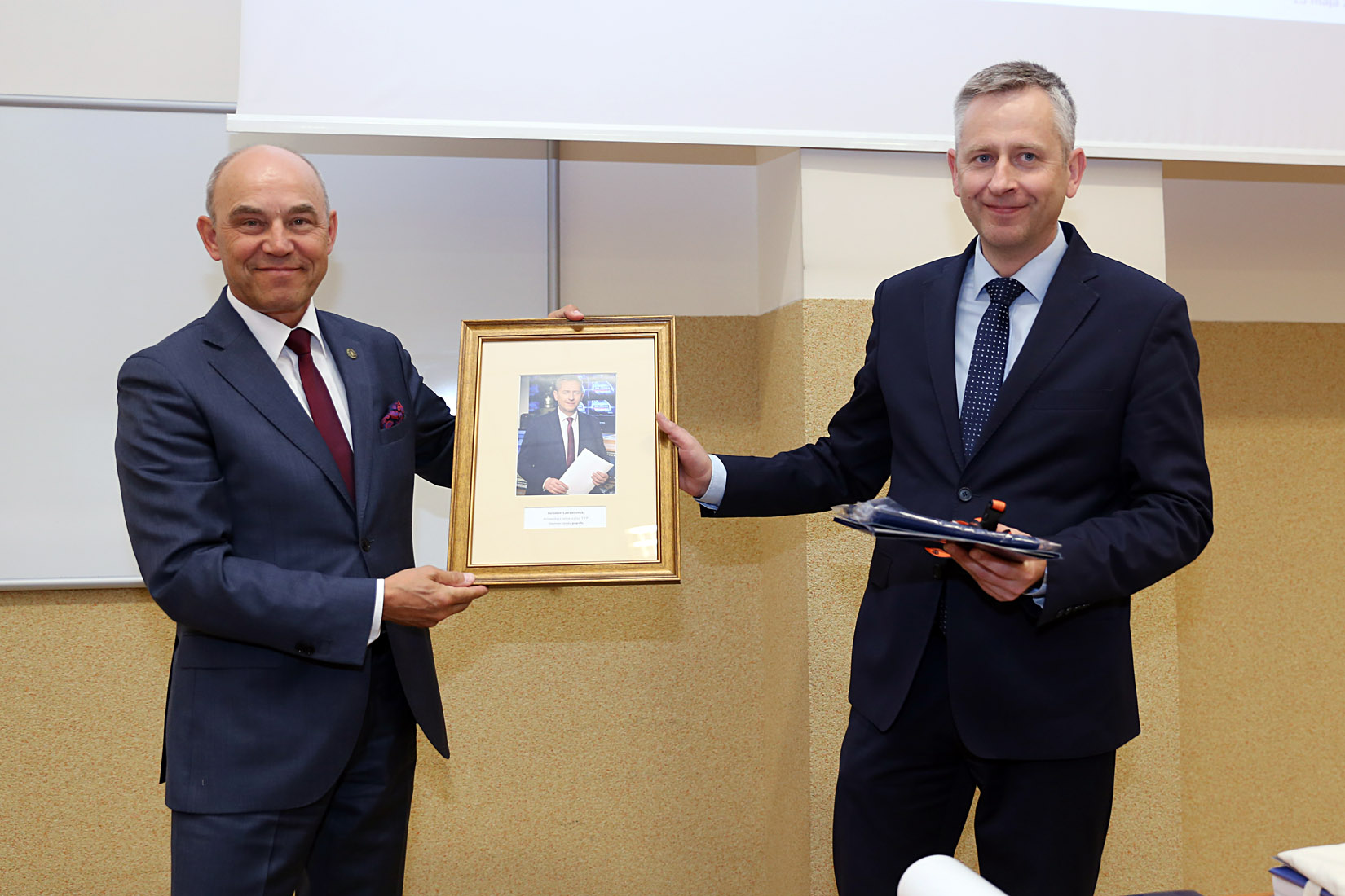 Dziekan Wydziału prof. Wojciech Wysota z nowym absolwentem w Galerii Sław red. Jarosławem Lewandowskim, dziennikarzem TVP